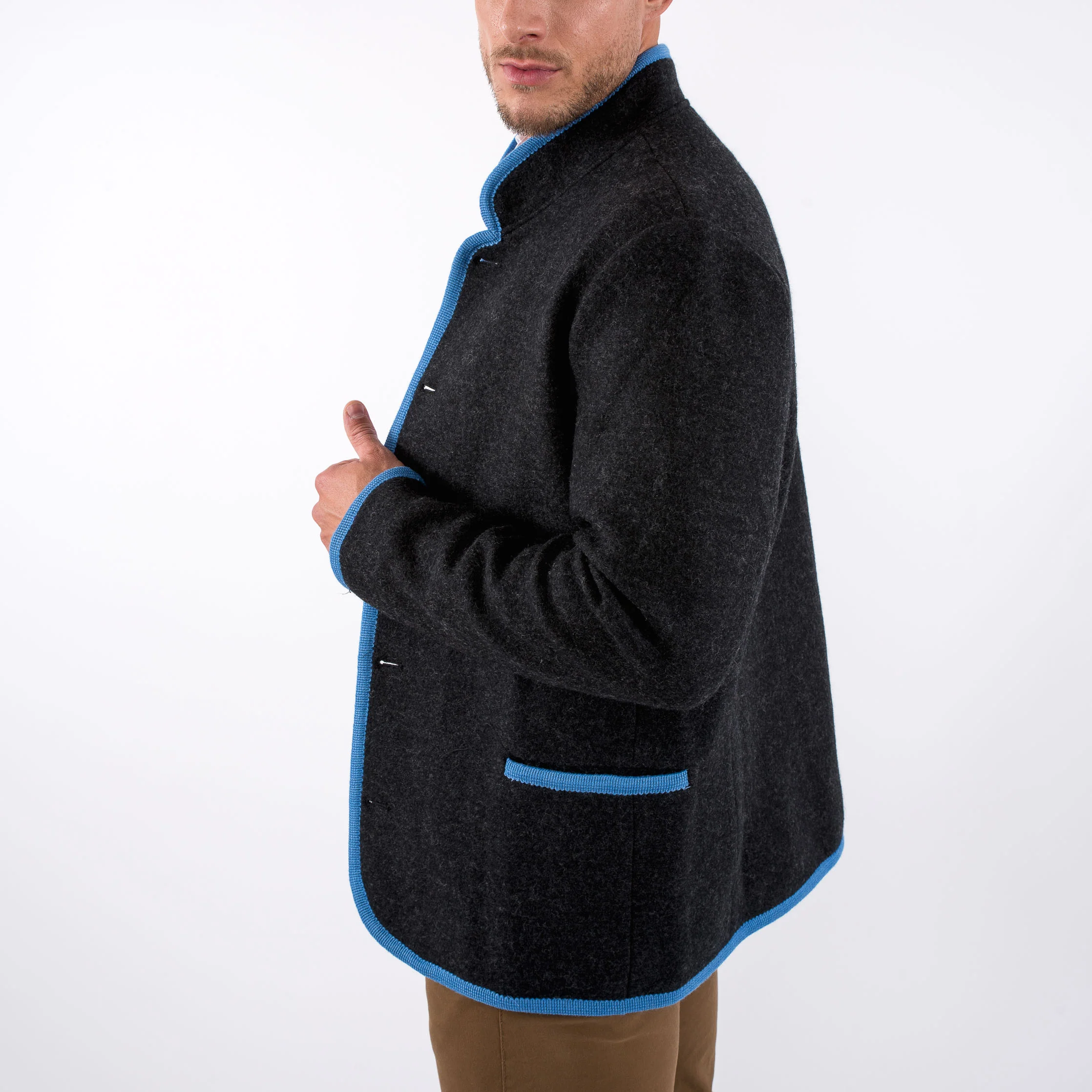 The Thomas features sartorial features similar to the Bavarian style, with a hand sewn contrasting trim running along the edge and around the short mandarin style collar.